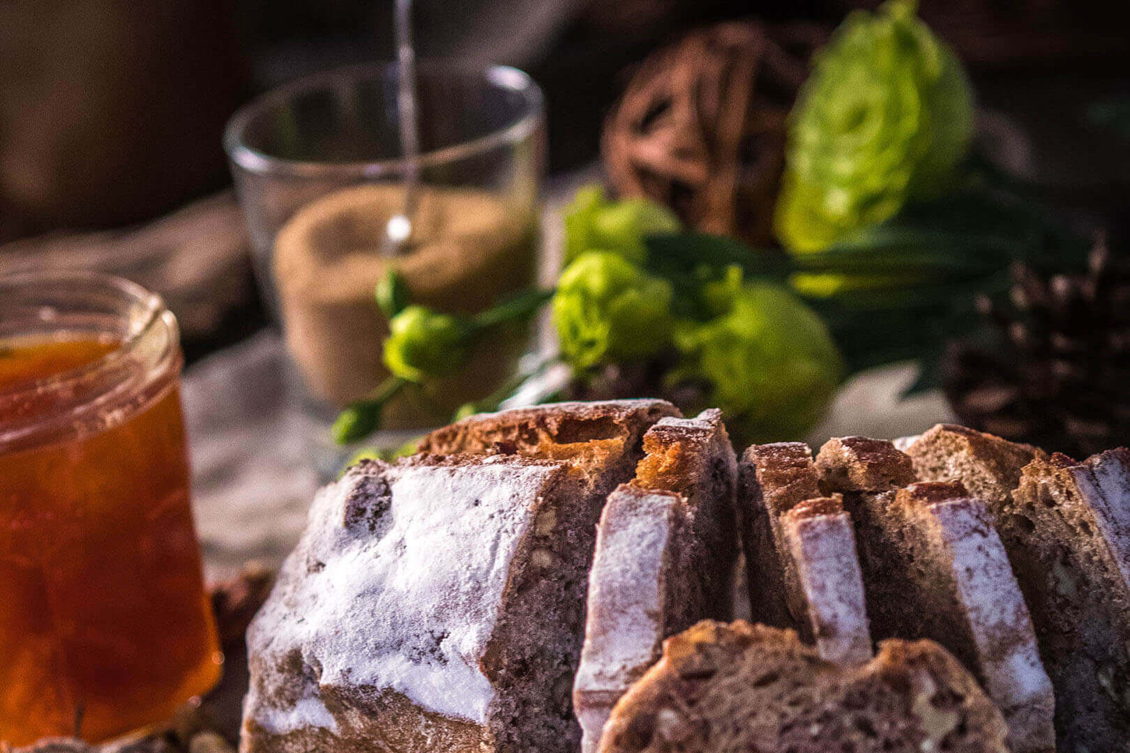 Le Pain au Souchet est un pain moulé, aux nuances caramel. La farine de souchet, connue pour ses qualités nutritionnelles, ne contient pas de gluten. Sa mie aux petites alvéoles a de légères saveurs de cacahuète. Le Pain au Souchet est préparé avec de la farine de souchet écrasée à la meule de pierre, du levain naturel (sans aucun additif de levure), de l’eau, juste ce qu’il faut de sel…Le pain aux Noix