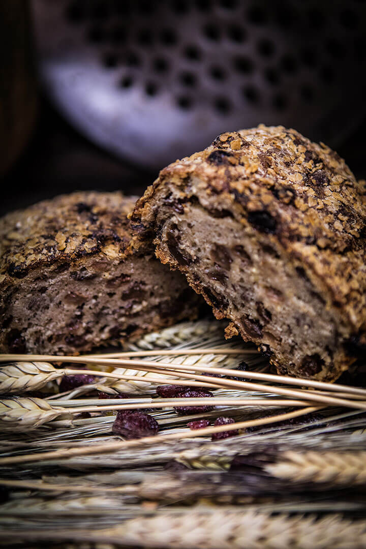 Le Pain Mi-figue Mi-raisin est d’abord un régal pour les yeux : c’est un pain moulé, fariné sur le dessus, qui prend très facilement des airs de gâteau de Noël. Une fois tranché, on découvre l’opulence de figues, de raisins et de noisettes entières qui prennent la vedette sur la farine de seigle ! A la dégustation, c’est un pain à la mie onctueuse, dont la mâche alterne entre le…Le pain Cranberries Oranges Confites
