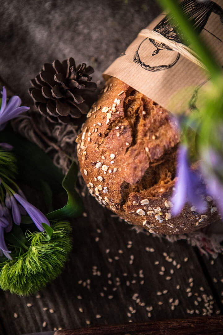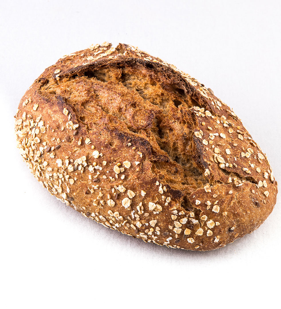 Le Pain Champêtre est un pain à conçu avec des farines semi-complètes de blé, de seigle, d’avoine et de sarrasin. Sa croûte est sertie des graines et des flocons que l’on retrouve de manière subtile dans la mie. C’est un pain riche en arômes, avec une belle cuisson à cœur. Ses alvéoles sont nacrées, de différentes tailles. Sa mâche alterne entre le fondant de la mie et le léger croquant…