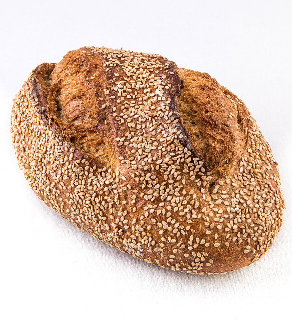Le Pain au Sésame est un joli pain doré serti de graines de sésame. Sa mie, resserrée du fait d’un façonnage intensif, est très moelleuse. Sa dégustation est savoureuse et les graines de sésame ont un goût délicat et prolongé en bouche. Le Pain au Sésame est préparé avec de la farine demi-complète écrasée à la meule de pierre, du levain naturel (sans aucun additif de levure), de l’eau, juste…